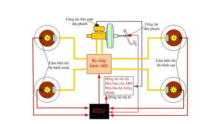 Hệ thống chống bó cứng phanh ABS gồm 4 bộ phận chính, phối hợp chặt chẽ với nhau: