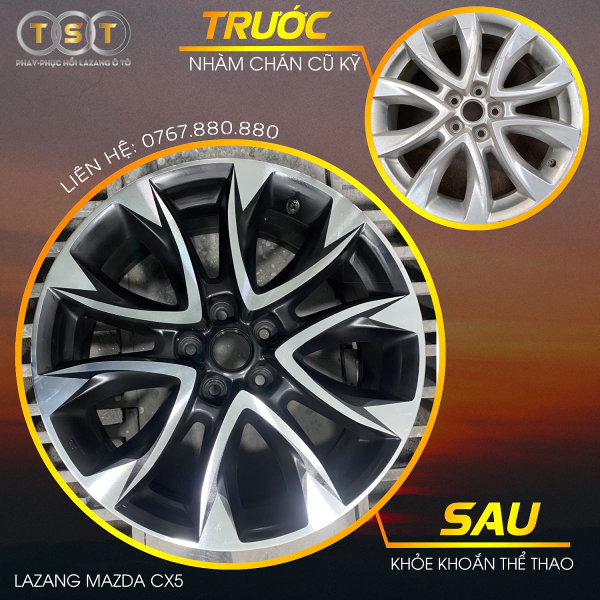 Việc phay lazang CX-5, làm đẹp lazang ô tô hay thậm chí nâng cấp lazang ô tô theo phong cách cá nhân là điều nhiều chủ xe lựa chọn sau khi mua xe cũ, nhằm cải thiện thẩm mỹ và cảm giác lái. Tuy nhiên, các hạng mục này cũng cần được tính vào ngân sách tổng thể. Trung tâm phục hồi lazang ô tô TST Hà Nội là địa chỉ uy tín chuyên phục hồi mâm xe ô tô, phay lazang, đánh bóng lazang, xử lý mâm xe bị oxi hóa, độ lazang xe ô tô và tư vấn giá sơn lazang ô tô minh bạch. Với đội ngũ kỹ thuật giàu kinh nghiệm và trang thiết bị hiện đại, TST giúp chiếc xe của bạn luôn đạt trạng thái an toàn, thẩm mỹ và giá trị cao nhất.