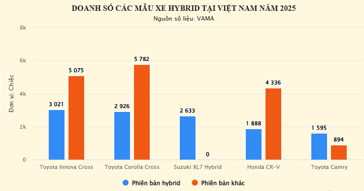 Theo số liệu từ VAMA, năm 2025, doanh số xe hybrid tại Việt Nam đạt 14.171 xe, tăng 43,6% so với năm 2024 và chiếm khoảng 6,5% tổng lượng ô tô du lịch bán ra. Đáng chú ý, cuộc chơi này vẫn chủ yếu là “sân nhà” của các thương hiệu Nhật Bản, đặc biệt là Toyota.